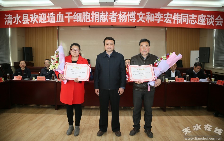 3月31日,清水縣委、縣政府隆重召開歡迎造血干細胞捐獻者楊博文、李宏偉座談會,對兩位造血干細胞捐獻者進行表彰,動員全縣上下大力弘揚“人道、博愛、奉獻”的紅十字精神,迅速掀起向楊博文、李宏偉學習的熱潮?h委常委、常務副縣長牛永禎主持座談會。