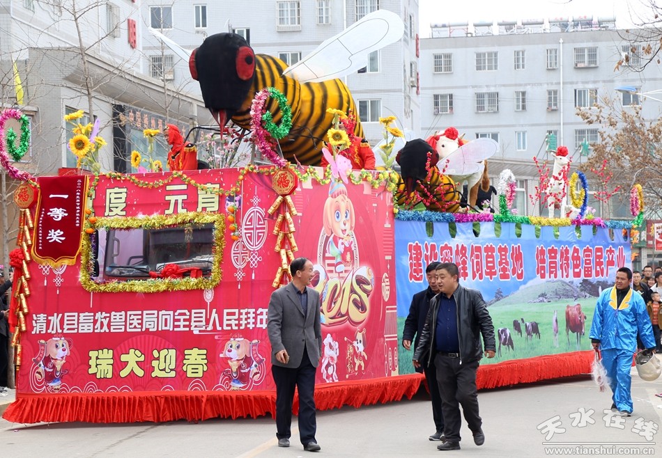 扭秧歌、舞獅、舞龍等社火隊(duì)伍氣勢(shì)雄渾,展示出清水人民奮力拼搏、真抓實(shí)干、創(chuàng)新超越的精神風(fēng)貌;劃旱船、高蹺、高桿、秦腔臉譜獨(dú)具民俗特色,深受城鄉(xiāng)群眾喜愛(ài),尤其是各部門(mén)、各鄉(xiāng)鎮(zhèn)自發(fā)組織的彩車隊(duì)伍主題鮮明,“不忘初心 牢記使命”、“一戶一策”、“改善民生”、“林果富農(nóng)”、“全面小康”等字眼更是引人注目,更加激勵(lì)了全縣人民決戰(zhàn)脫貧攻堅(jiān)、決勝全面小康、建設(shè)幸福美好新清水的決心和豪情。