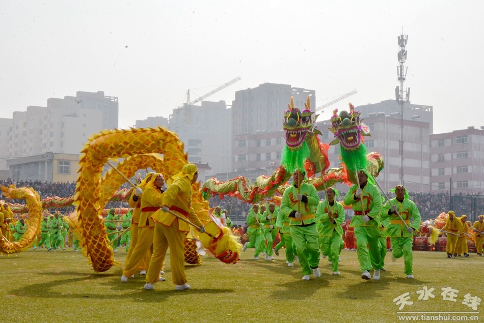 在歡快的鼓聲中,龍騰盛世表演在整齊的鼓聲中奔騰而出,舞龍表演共分為祥龍出宮、飛龍起舞、金龍團圓等幾個片斷。伴隨著新春喜慶的鑼鼓,縣直六大口40多個單位700多位干部職工揮舞著70條巨龍,時而上下穿梭、時下騰空而起,時而你追我趕,集中展示了清水兒女意氣風(fēng)發(fā)、乘勢而上的時代精神。70條彩龍寓意為新中國成立70周年獻禮,其中56條大龍象征56個民族,14條小龍象征著祖國的輝煌與發(fā)展,寓意在新的一年里民族團結(jié),和和美美,欣欣向榮。