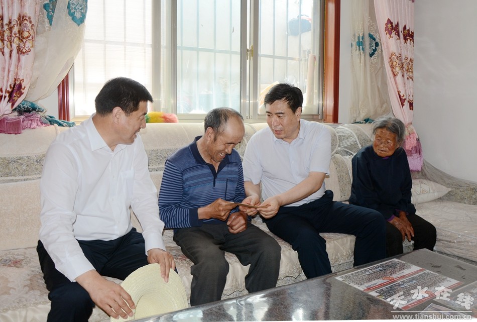 在白駝鎮(zhèn)林屲村、化嶺村和新城鄉(xiāng)大陸村,代表團(tuán)實(shí)地查看了特困群眾安置點(diǎn)、勞務(wù)培訓(xùn)、產(chǎn)業(yè)發(fā)展、教育教學(xué)、扶貧車(chē)間等工程建設(shè)及兩村產(chǎn)業(yè)發(fā)展情況后,天津市河北區(qū)領(lǐng)導(dǎo)劉志強(qiáng)、李子英、金強(qiáng)、王海山、劉云光、王志剛分別與清水縣貧困戶(hù)楊福錄、魏兆祥、汪世祥、金海倉(cāng)、魏貴榮、梁金田結(jié)成幫扶對(duì)子,給他們送去了慰問(wèn)金。在貧困戶(hù)家中,劉志強(qiáng)與他們拉起了家常,詳細(xì)詢(xún)問(wèn)致貧原因、家庭收入、子女上學(xué)就業(yè)、產(chǎn)業(yè)發(fā)展等生產(chǎn)生活情況。看到他們?cè)谡木珳?zhǔn)幫扶下,脫貧信心十足,環(huán)境衛(wèi)生干凈整潔,生活水平不斷提高時(shí),劉志強(qiáng)勉勵(lì)他們要增強(qiáng)脫貧信心、戰(zhàn)勝困難,通過(guò)自己勤勞努力,力爭(zhēng)早日過(guò)上好日子。