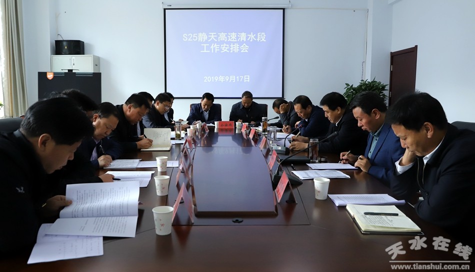 9月17日,天水市人大常委會副主任、清水縣委書記劉天波主持召開S25靜天高速清水段工作安排會?h委副書記、縣長馬越垠,縣委常委、副縣長秦永斌,縣委常委、政法委書記王懷珍,副縣長馬小平及縣交通局、自然資源局等相關部門負責人參加了會議。