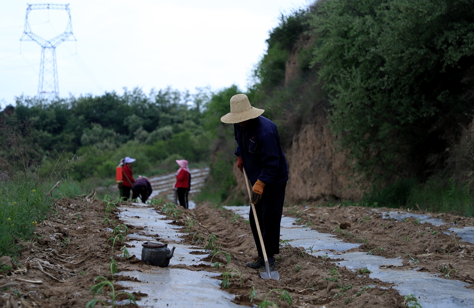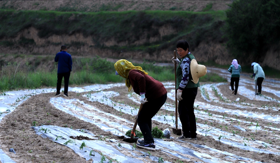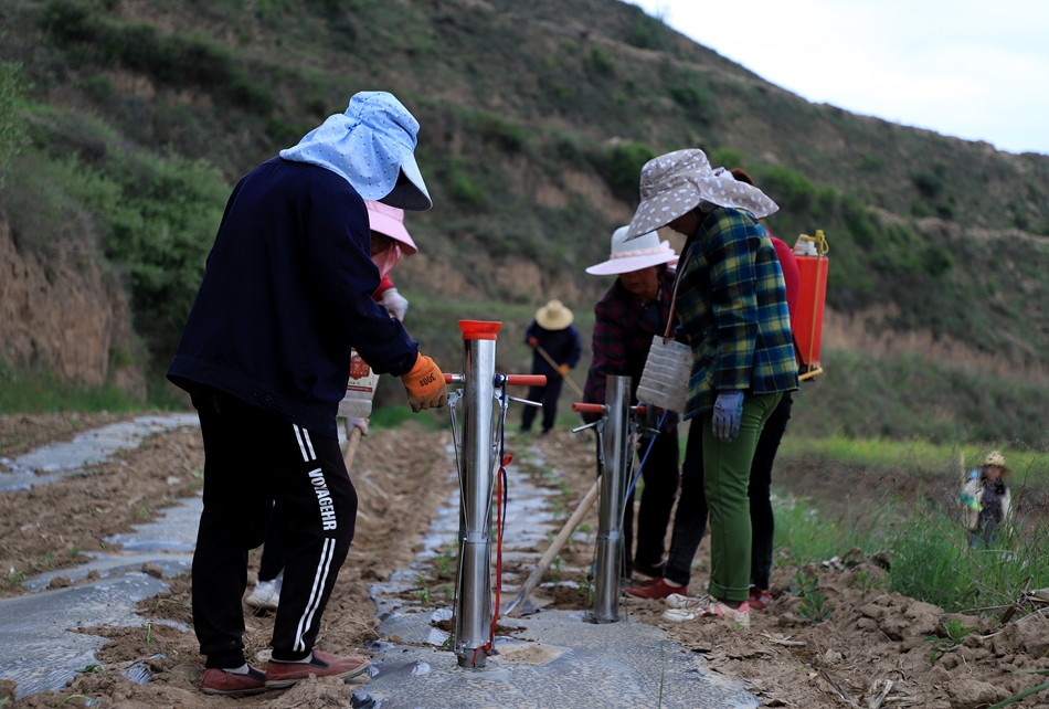 放眼望去,生機(jī)勃勃的田間地頭,三人一組貓著腰,弓著背,熟練地用栽植“神器”在提前覆好的黑色農(nóng)膜上鉆出小孔,然后栽入幼苗,再用鐵鍬培上土,一鏟一鋤,干勁十足。