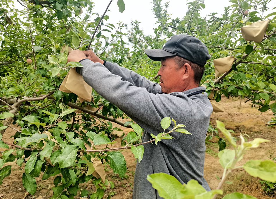 在柏樹梁蘋果種植基地內(nèi),記者看到,7000畝蘋果樹在陽光的照耀下翠綠一片,剛結(jié)出的小果貪婪的吸收著陽光快速生長(zhǎng)。一棵棵果樹身姿挺拔,孕育著新一年豐收的希望。工人們正在地里為蘋果套袋,看著逐漸成長(zhǎng)的果樹,他們的臉上掛著掩飾不住的喜悅。
