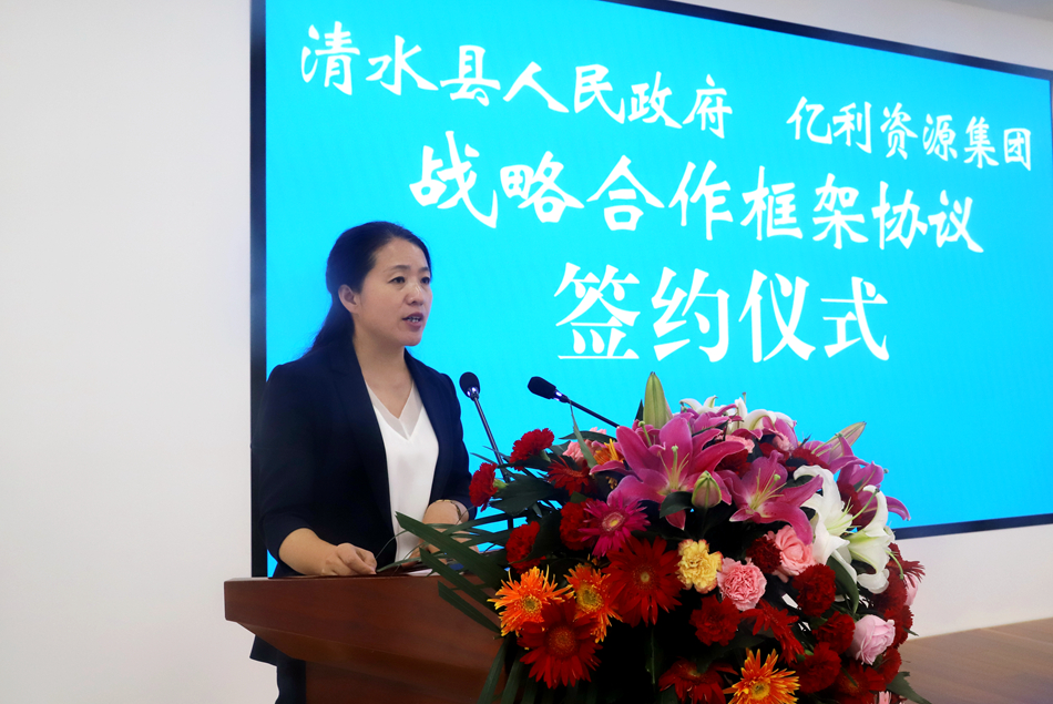 縣委副書記、縣長李菊霞在致辭中表示,清水縣政府與億利集團(tuán)簽訂戰(zhàn)略合作框架協(xié)議,既是清水發(fā)展的一個良好機(jī)遇,也是雙方在新能源等合作領(lǐng)域取得重大突破的一個新的起點。億利集團(tuán)作為中國百強(qiáng)民營企業(yè),是中國生態(tài)修復(fù)領(lǐng)軍企業(yè)和聯(lián)合國認(rèn)定的全球治沙領(lǐng)導(dǎo)者企業(yè);在全面推動光伏治沙規(guī)模化發(fā)展、清潔能源領(lǐng)域取得了重大成就。我縣與貴企建立戰(zhàn)略合作關(guān)系,就是充分利用貴企的人才、技術(shù)、資金等資源優(yōu)勢,開展全方位、多層次的深度務(wù)實合作,必將促進(jìn)億利集團(tuán)進(jìn)一步做大規(guī)模、做強(qiáng)市場;必將對清水縣域經(jīng)濟(jì)高質(zhì)量發(fā)展注入強(qiáng)勁動力、增添新的活力。希望億利集團(tuán)把新的理念、新的模式帶到清水,滿懷感情、肩負(fù)責(zé)任,全面參與清水發(fā)展,切實把合作項目組織好、實施好。我們將始終堅持“企業(yè)為尊”理念,著力提供最優(yōu)的政策支持、最佳的政務(wù)服務(wù)、最好的合作環(huán)境,全力支持億利集團(tuán)在清水投資興業(yè),推動合作項目早日落地、早結(jié)碩果。