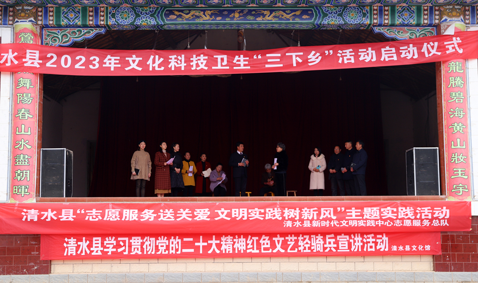 1月12日,清水縣2023年文化科技衛(wèi)生“三下鄉(xiāng)”活動在秦亭鎮(zhèn)啟動。清水縣委常委、宣傳部部長馬小平,縣政府副縣長金學民參加啟動儀式。