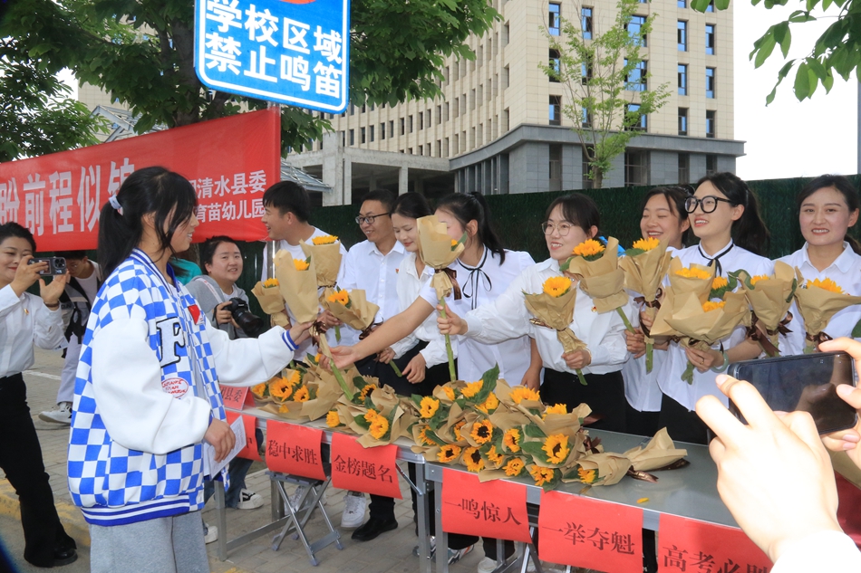 “今天共青團(tuán)清水縣委和育苗幼兒園給考生準(zhǔn)備了100束向日葵花束,為考生們送去一舉奪‘葵’的祝福,祝所有考生金榜題名,一舉奪魁。”毓秀育苗幼兒園園長王亞麗說。