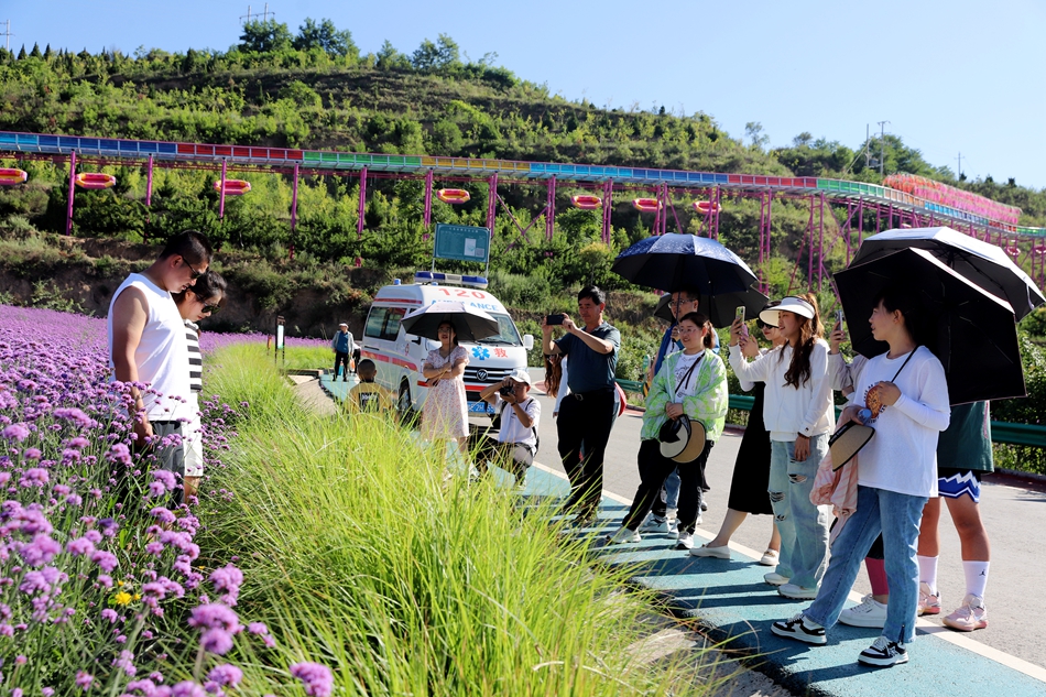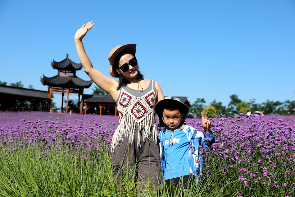 初秋,清水縣花舞北山的馬鞭草、薰衣草花開正艷,放眼望去,猶如一片紫色的海洋,如夢如幻,極盡浪漫。七彩水滑、愛心花架、復古涼亭等景觀錯落有致,吸引一批又一批的縣外游客前來觀光打卡,北山生態(tài)景區(qū)在這個暑假迎來新的旅游高峰。
