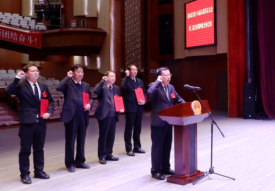 新當(dāng)選的清水縣人民政府縣長(zhǎng)王濤走到宣誓臺(tái)前,面對(duì)國(guó)徽,左手撫按憲法,右手舉拳領(lǐng)誓,縣人大常委會(huì)副主任王懷珍,委員蘇富祥、馬龍、杜亞峰集體宣誓:“我鄭重宣誓,忠于中華人民共和國(guó)憲法,維護(hù)憲法權(quán)威,履行法定職責(zé),忠于祖國(guó)、忠于人民,恪盡職守、廉潔奉公,接受人民監(jiān)督,為建設(shè)富強(qiáng)民主文明和諧美麗的社會(huì)主義現(xiàn)代化強(qiáng)國(guó)努力奮斗。”