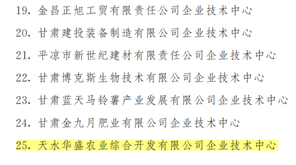 近日,甘肅省工信廳公布了2023年技術創(chuàng)新平臺認定名單,天水華盛農(nóng)業(yè)綜合開發(fā)有限公司成功獲批省級企業(yè)技術中心。