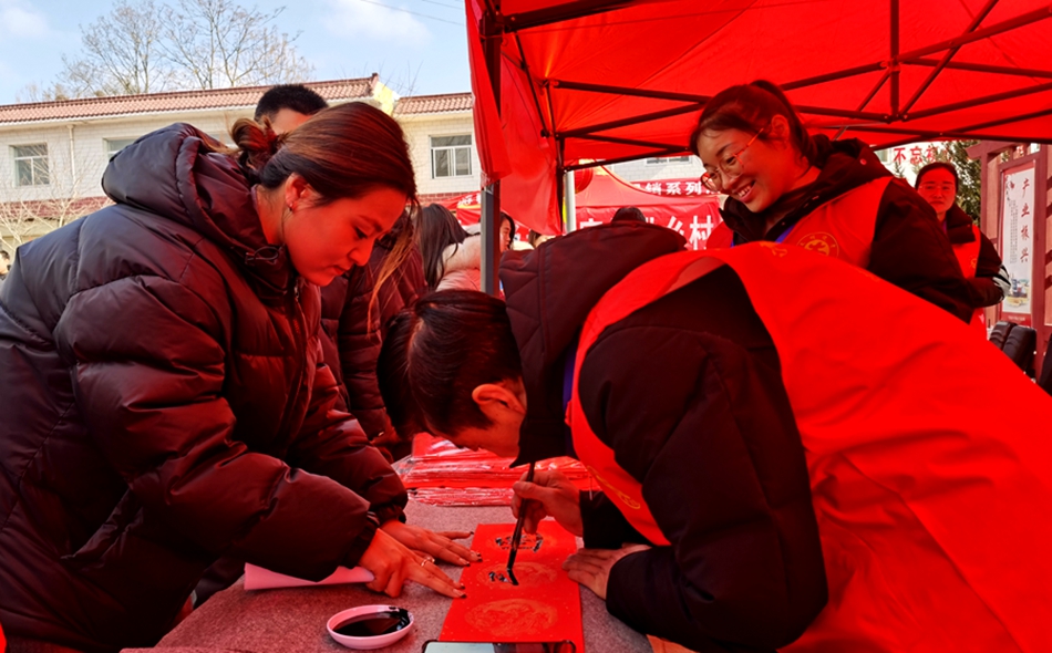 在書法寫作區(qū),“天增歲月人增壽,春滿乾坤福滿門”等高高掛起的紅色春聯(lián)和“!弊窒矐c熱烈,氤氳墨香。來自縣美術(shù)協(xié)會、縣書法協(xié)會的書畫家現(xiàn)場揮毫潑墨寫春聯(lián)、送“!弊帧嫾炎、用筆墨向群眾傳遞新年的美好祝福與問候,現(xiàn)場的群眾駐足欣賞、紛紛稱贊,同時也領(lǐng)取到了自己心儀的對聯(lián)。