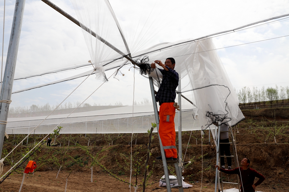在郭川鎮(zhèn)廟山梁二十埫地果園內(nèi),一排排果樹排列整齊、含苞待放,工人們正緊張有序的鋪設(shè)防雹網(wǎng),一片片白色的網(wǎng)狀防雹網(wǎng),如同給果樹搭起了“保護(hù)屏障”,有效預(yù)防冰雹的同時(shí)又不影響果樹采光通風(fēng)。郭川鎮(zhèn)金坪塬千畝老舊果園改造示范點(diǎn),又是另一番繁忙景象,村民們正在開展黃豆的套種播種工作,旋耕機(jī)來回穿梭,一粒粒黃豆在農(nóng)民的手中播撒至肥沃的土壤中,廣袤的果園,忙碌的身影,構(gòu)成一幅和美春耕圖。