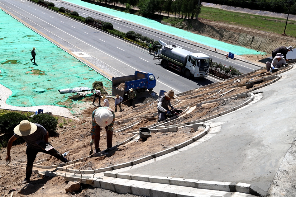 6月24日,記者來到項(xiàng)目建設(shè)路段,工人們緊張有序地進(jìn)行護(hù)欄打磨、護(hù)坡治理、鋪設(shè)地磚、打掃衛(wèi)生等收尾工作。