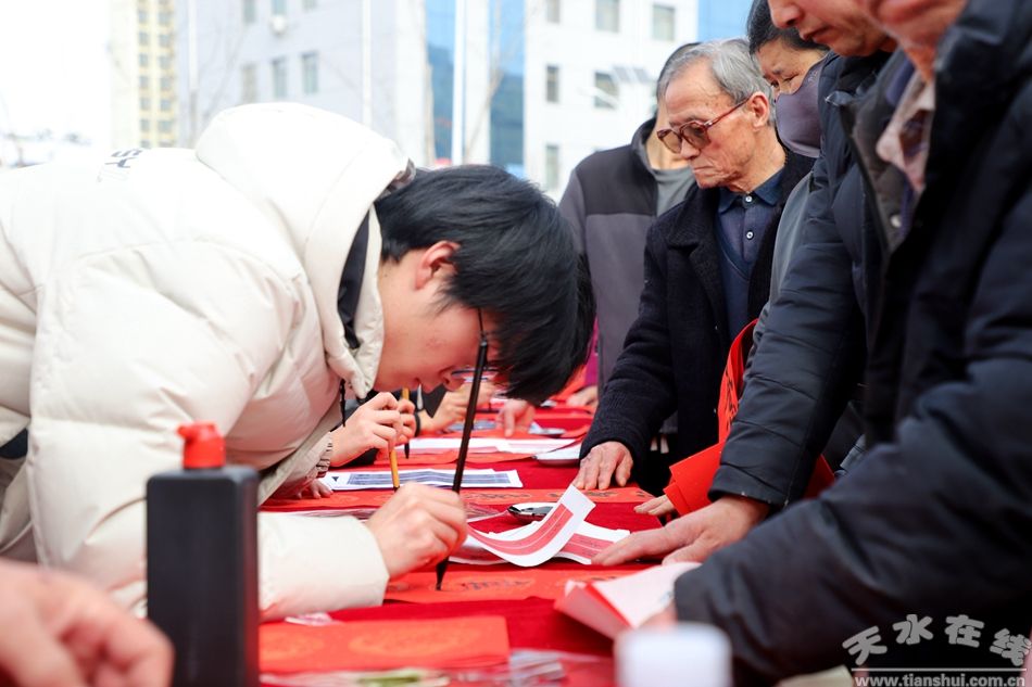 “翰墨迎春傳黨音”環(huán)節(jié)暖意融融?h文聯(lián)的書法家和縣書法培訓班的學員們揮毫潑墨,筆走龍蛇間,一幅幅飽含新春祝福的春聯(lián)、福字新鮮出爐。大紅的春聯(lián)承載著滿滿的關懷,志愿者們將其一一送到群眾手中,讓墨香伴著黨音,把溫暖與希望傳遞到千家萬戶。