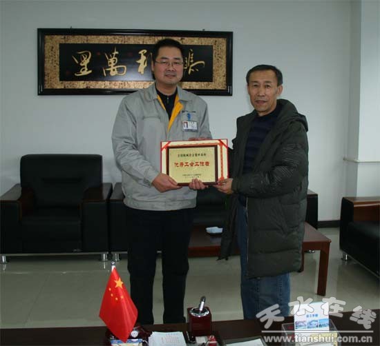 2012年月1月6日,甘肅省機械冶金工會主席李力克、副主席尹會清代表全國機冶工會赴天水專程為長開廠公司和楊大友授了獎牌。