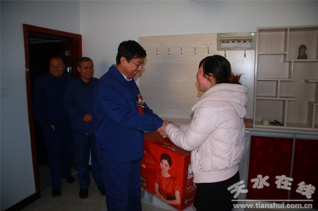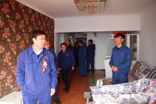 吳總一行首先來到2#樓1單元8樓住戶四分廠員工程石岳家中,當鞭炮在樓下響起時,吳總握住了程石岳的手說:“祝賀你,祝賀你喬遷新居,我們公司領導來對你表示慰問”。 程石岳激動地說:“謝謝董事長,謝謝公司對我們的關懷,我一定努力工作,用實際行動回報公司領導對我的關懷”。然后公司領導一一慰問了二分廠員工馬紀榮,一分廠員工董小軍、馬邱林,當吳總一行最后來到董小軍家時,他已經入住,房子收拾的簡單大方,吳總說,“我們來慰問你,是對你工作的肯定,希望你能繼續(xù)努力,好好工作,以優(yōu)秀的成績回報公司!倍≤娂拥卣f:“感謝吳總,感謝公司領導對我的關懷,我不會辜負領導對我的信任,我會兢兢業(yè)業(yè),好好工作,把公司領導的關懷體現(xiàn)在自己的工作上”。
