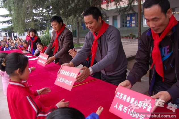 2009年,商會為天水教育事業(yè)捐款15.3萬元;2010年,為秦州區(qū)娘娘壩鎮(zhèn)中學(xué)和李子中學(xué)捐獻價值40萬元電腦100臺;2011年,捐獻30萬元助力天水市扶貧事業(yè); 同年,商會在秦州區(qū)七里墩小學(xué)和張家川縣東街小學(xué)分別投資建立了“江蘇商會愛心書屋”;2012年,“六一”兒童節(jié)來臨之際,商會為清水縣黃門鄉(xiāng)中心小學(xué)學(xué)生捐贈了價值10萬元的圖書和學(xué)習(xí)用品;同年9月為清水縣6名貧困大學(xué)生圓夢校園捐助現(xiàn)金3萬元;同年11月11日,商會為甘谷縣新興鎮(zhèn)磐石小學(xué)校門建設(shè)資助15萬元;2013年秋,為秦州區(qū)汪川鎮(zhèn)柏陽村維修水泵捐贈7000元,為麥積區(qū)永慶村修公路捐贈20000元。