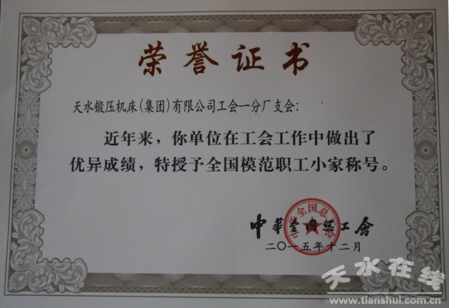 在3月7日上午召開的天水市總工會五屆四次全委(擴大)會上,時宣讀了中華全國總工會的表彰決定,授予天水鍛壓機床(集團)有限公司第一聯(lián)合分廠工會為模范職工小家。