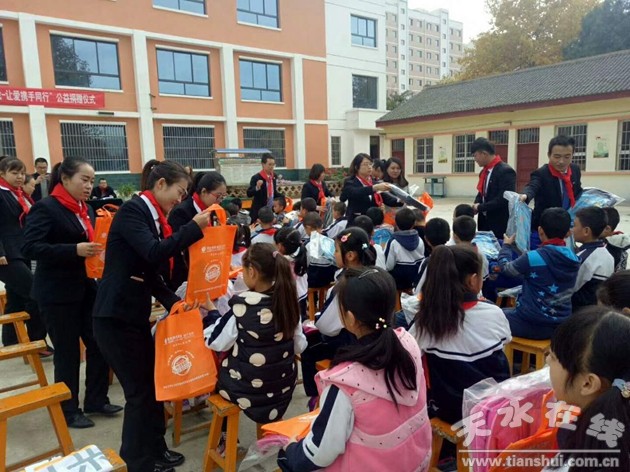 據(jù)介紹,天水市麥積區(qū)馬跑泉鎮(zhèn)潁川小學學生多為甘肅中車集團天水7452工廠的下崗職工子女,由于近幾年天水7452造紙廠、啤酒廠效益差,營業(yè)狀態(tài)趨于倒閉,好多下崗職工在家待業(yè),無收入來源,個別貧困學生家庭甚至無力承擔購買孩子所需的學習用品費用。陽光產(chǎn)險天水中支總經(jīng)理王昌建獲悉后,立即安排部署,抓緊落實購置捐贈學習用品,并組織公司全體員工積極參與,認真踐行“分擔風雨 共享陽光”的企業(yè)責任感。11月10日,“我是一縷陽光,溫暖整個世界”公益捐贈活動在天水市麥積區(qū)馬跑泉鎮(zhèn)潁川小學拉開帷幕,天水市麥積區(qū)馬跑泉學區(qū)校長馬萬林、主任蒲瑞琪,潁川小學校長袁存良,陽光產(chǎn)險天水中支總經(jīng)理王昌建,公司員工及學生家長共120余人參加了本次捐贈活動。