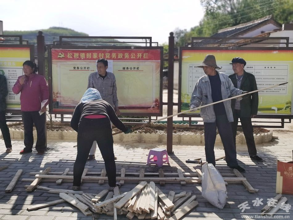 正午時分路過時家村,三、五個村民聚集在村委會院子里忙著制作圍欄,準備給村口的小花園筑一道保護屏障。另一邊,村委會的喇叭里村主任布置著明天栽樹的任務。
