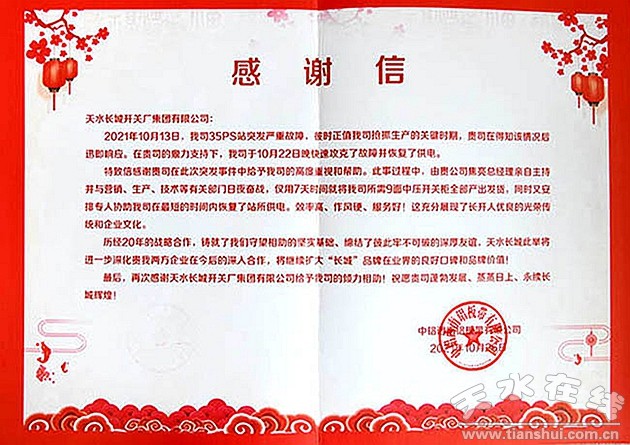 12月8日,長城電工天水長城開關(guān)廠集團(tuán)公司有限公司收到了來自中鋁西南板帶有限公司發(fā)來的感謝信和錦旗,對集團(tuán)公司的緊急救援并迅速恢復(fù)供電、有效降低損失表示感謝。