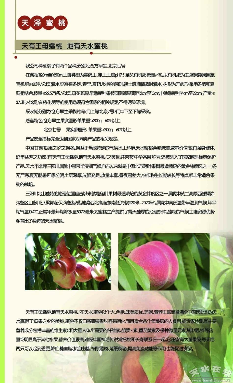 目前,位于天水市麥積區(qū)石佛鎮(zhèn)黃莊村的天澤果品農(nóng)民專業(yè)合作社種植的100畝“北京七號(hào)”蜜桃已經(jīng)成熟,開始采摘銷售。合作社歡迎大家到田間地頭品嘗購買,享受采摘樂趣。聯(lián)系人:楊永煒,電話:15352225026。