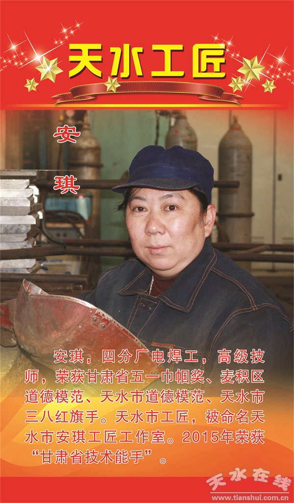 安琪,作為天水鍛壓集團(tuán)的一名女電煤工,一上班就從事于電焊工作,電焊看上去是男同志都望而卻步的工種,安琪卻毫不猶豫的選擇了它,并且一干就是28年,28年來,她始終把電焊當(dāng)作自己的一項(xiàng)神圣的職業(yè)來對(duì)待,她說:“電焊本是良心活動(dòng),一絲一毫都不能馬虎,要對(duì)得住用戶和企業(yè),更要對(duì)得住自己的良心!彼冀K堅(jiān)持“條條焊縫、表里如一”的理念,在工作中創(chuàng)造了不凡的業(yè)績,更為企業(yè)的高質(zhì)量發(fā)展作出了巨大的貢獻(xiàn),為此,她也多次獲得各項(xiàng)榮譽(yù),多年來被集團(tuán)公司評(píng)為“三八紅旗手”、“天水鍛壓勞!、“天水工匠”、“天水市三八紅旗手”、“甘肅省三八紅旗手”、“甘肅省五一巾幗獎(jiǎng)”、“甘肅省技術(shù)能手”、“甘肅省勞動(dòng)模范”,她于2021年紀(jì)念建黨100周年之際光榮的加入了中國共產(chǎn)黨。