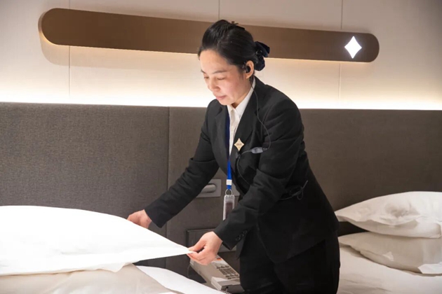 2023年,酒店迎來了大規(guī)模升級改造工程,客房部作為改造的核心區(qū)域,工程量最大、任務(wù)最艱巨,改造期間,既要配合施工隊完成舊設(shè)施拆除、新設(shè)施安裝工作,又要保證部分客房正常運營,還要妥善存放大量新舊物資,工作難度極大。面對這一挑戰(zhàn),張妍沒有退縮,而是主動扛起責(zé)任,作為一名女同志,張妍毫不示弱,和男員工一起抬家具、搬設(shè)備,汗水浸濕了衣衫,手上磨出了繭子,她卻從未抱怨過一句,每當(dāng)大家歇口氣的時候,她又會獨自返回房間,仔細檢查是否有遺留的配件或雜物,確保施工區(qū)域整潔有序。