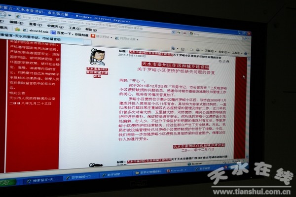通過現(xiàn)場查看、聽取匯報(bào)、翻閱資料、座談交流,考核組對秦州區(qū)2011年度《市委書記、市長留言板》網(wǎng)民留言辦理工作給予了充分肯定?己私M認(rèn)為,秦州區(qū)的網(wǎng)民留言辦理工作得到了區(qū)委、區(qū)政府主要領(lǐng)導(dǎo)的重視度高,批示辦理迅速。留言辦理的組織機(jī)構(gòu)健全,建立了督辦長效機(jī)制,答復(fù)明確,督辦得力,推動了工作落實(shí)。同時,考核組就下一階段留言板辦理工作提出“三個加強(qiáng)”和“三個結(jié)合”的工作要求:要加強(qiáng)網(wǎng)絡(luò)輿論引導(dǎo),要加強(qiáng)問政平臺建設(shè),要加強(qiáng)網(wǎng)民問政水平;與推動黨委政府決策落實(shí)相結(jié)合,與改善民生相結(jié)合,與創(chuàng)新督查方式相結(jié)合。