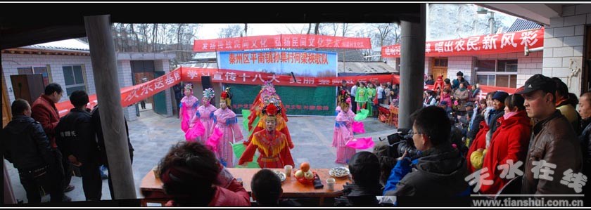 這天,平南鎮(zhèn)呈現(xiàn)出一片歡快、和諧、喜慶的節(jié)日氛圍,到處洋溢著濃濃的年味。秦州區(qū)文化館組織相關媒體及工作人員一行十余人先后赴平南鎮(zhèn)王坡村、孫集何家梁村、落地村,借助外出務工農(nóng)民工返鄉(xiāng)的大好時機和當?shù)馗挥械赜蛱厣难砀枭缁,大力宣傳黨的十八大精神以及各項文化惠民政策,村民表演的《繡荷包》、《轉(zhuǎn)娘家》、《十杯酒》等一個個民俗節(jié)目,逗得大家樂開了懷。在喜迎新春的同時,寓樂于學,把黨的十八大精神滲透在各項文化活動中;區(qū)文廣局黨總支副書記、紀檢組長王杰玉向平南鄉(xiāng)鎮(zhèn)文化站頒發(fā)了2012年綜合考核先進單位榮譽證書;區(qū)文化館館長趙暉對平南鎮(zhèn)黑社火表演給予了高度評價,并對下一步節(jié)目展演等提出一系列建設性的意見和建議。