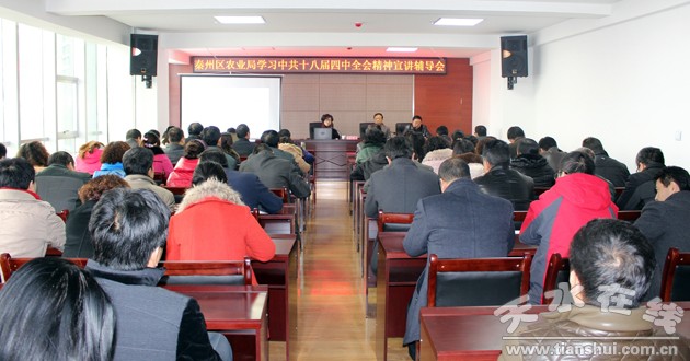 12月9日,秦州區(qū)委宣講團(tuán)深入?yún)^(qū)農(nóng)業(yè)局宣講十八屆四中全會(huì)精神,區(qū)委宣講團(tuán)成員、區(qū)委黨校講師王永利向該局領(lǐng)導(dǎo)班子、局機(jī)關(guān)干部、局屬各單位負(fù)責(zé)人、干部等80余人作了宣講報(bào)告。
