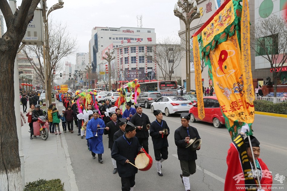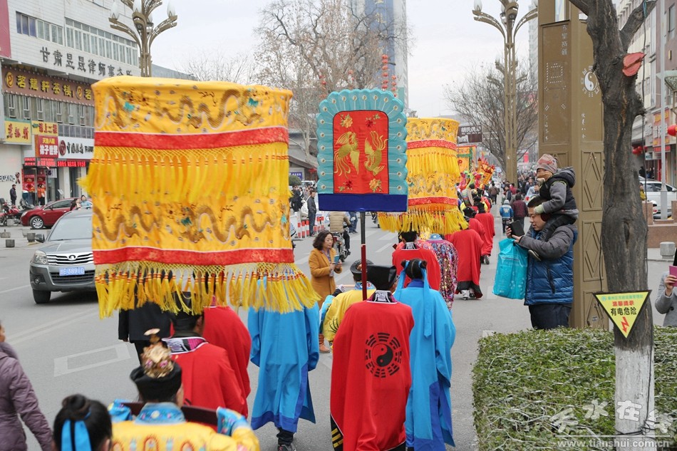 2月26日(農(nóng)歷正月初八日)下午,秦州區(qū)玉泉觀舉行“越廟”儀式。圖為隊(duì)伍經(jīng)過秦州區(qū)華聯(lián)商廈十字路口,前往伏羲廟。