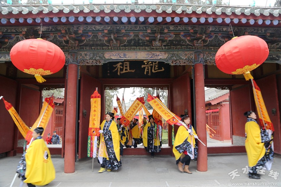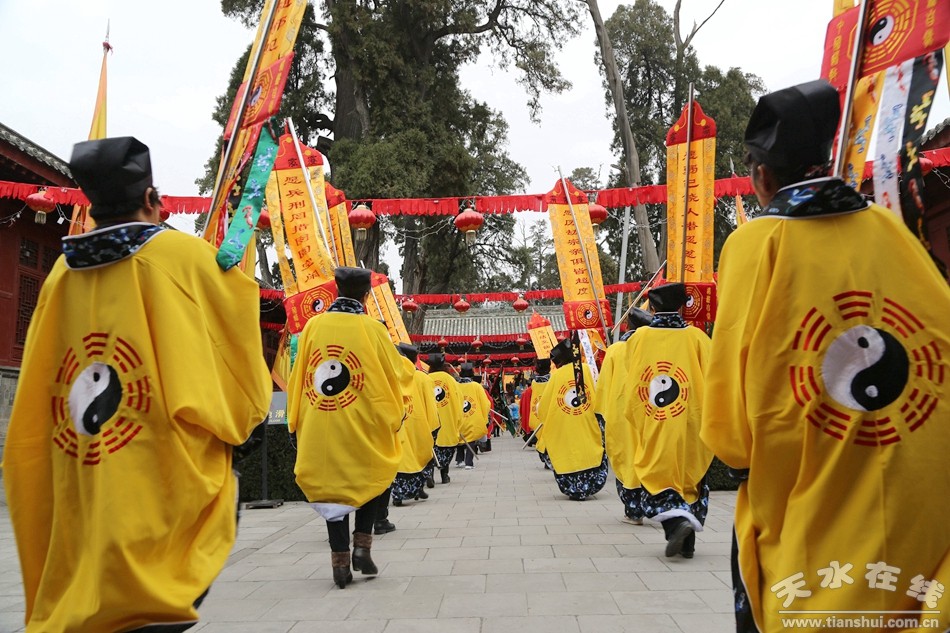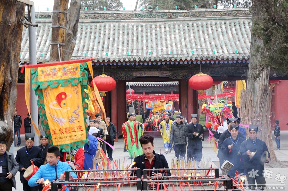 2月26日(農(nóng)歷正月初八日)下午,秦州區(qū)玉泉觀舉行“越廟”儀式。圖為隊伍抵達伏羲廟太極殿前。 |