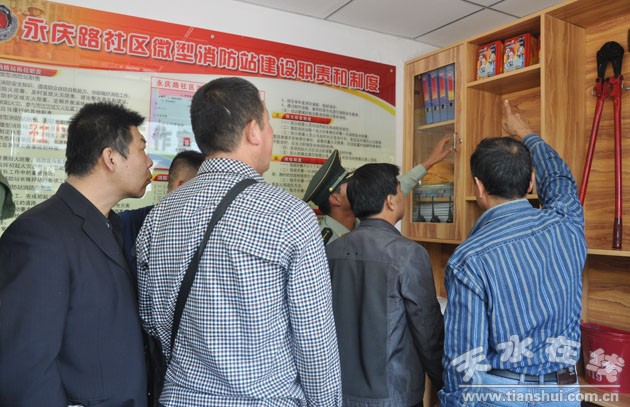 下午,西關(guān)街道組織群眾進(jìn)行了實(shí)地演練,消防官兵現(xiàn)場示范了消防器材的使用,遇到火災(zāi)后處置的先后順序以及人員部署。隨后參會(huì)人員參觀了永慶路社區(qū)微型消防站的基礎(chǔ)設(shè)施和宣傳版面,并詳細(xì)記錄下來。