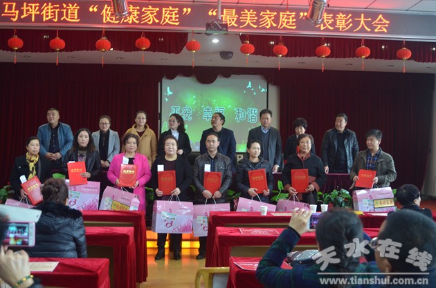 “傳遞最美真諦 感悟家庭幸!,11月3日下午,石馬坪街道辦事處在天水市財(cái)險(xiǎn)大廈舉辦了“平安、幸福、和諧”健康家庭、最美家庭表彰大會,對轄區(qū)內(nèi)25戶健康家庭和12戶最美家庭獲得者進(jìn)行了表彰。區(qū)衛(wèi)計(jì)局、區(qū)婦聯(lián)、石馬坪街道領(lǐng)導(dǎo)出席活動并為受表彰家庭頒獎,石馬坪街道干部、社區(qū)居民300余人參加了活動,街道還為大會組織了一場自己編排的精彩文藝節(jié)目。表彰大會座無虛席,社區(qū)居民、街道干部表演的獨(dú)唱、舞蹈、小品等節(jié)目精彩紛呈,演出中還穿插了有關(guān)法律、計(jì)生、禁毒等方面的有獎知識問答互動環(huán)節(jié),居民們積極參與,現(xiàn)場氣氛活躍、高潮迭起,臺上臺下融為一體。