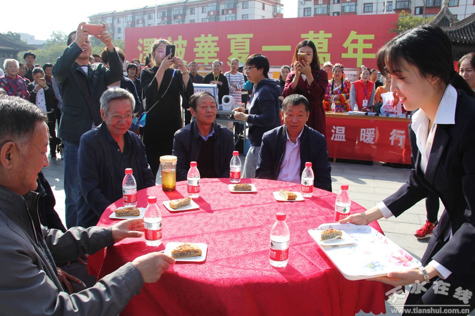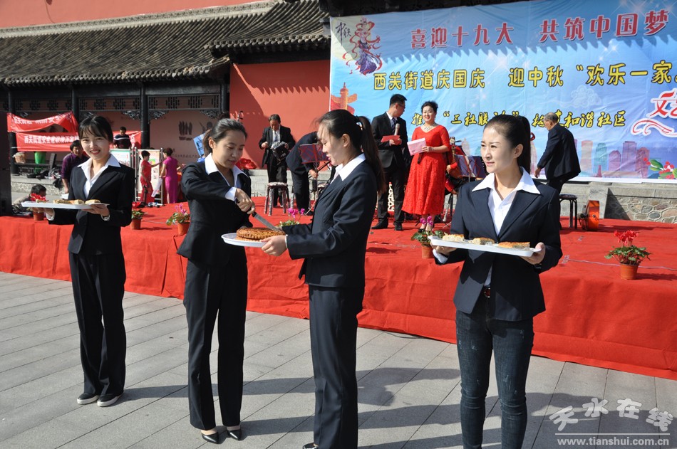 活動(dòng)當(dāng)天,在秦州古城伏羲廣場(chǎng)早早的聚集了幾百號(hào)人,又是發(fā)宣傳資料,又是節(jié)目表演,好不熱鬧。兩個(gè)大圓桌擺滿了月餅,更是吸引了眾多目光,引得人們紛紛駐足觀看。