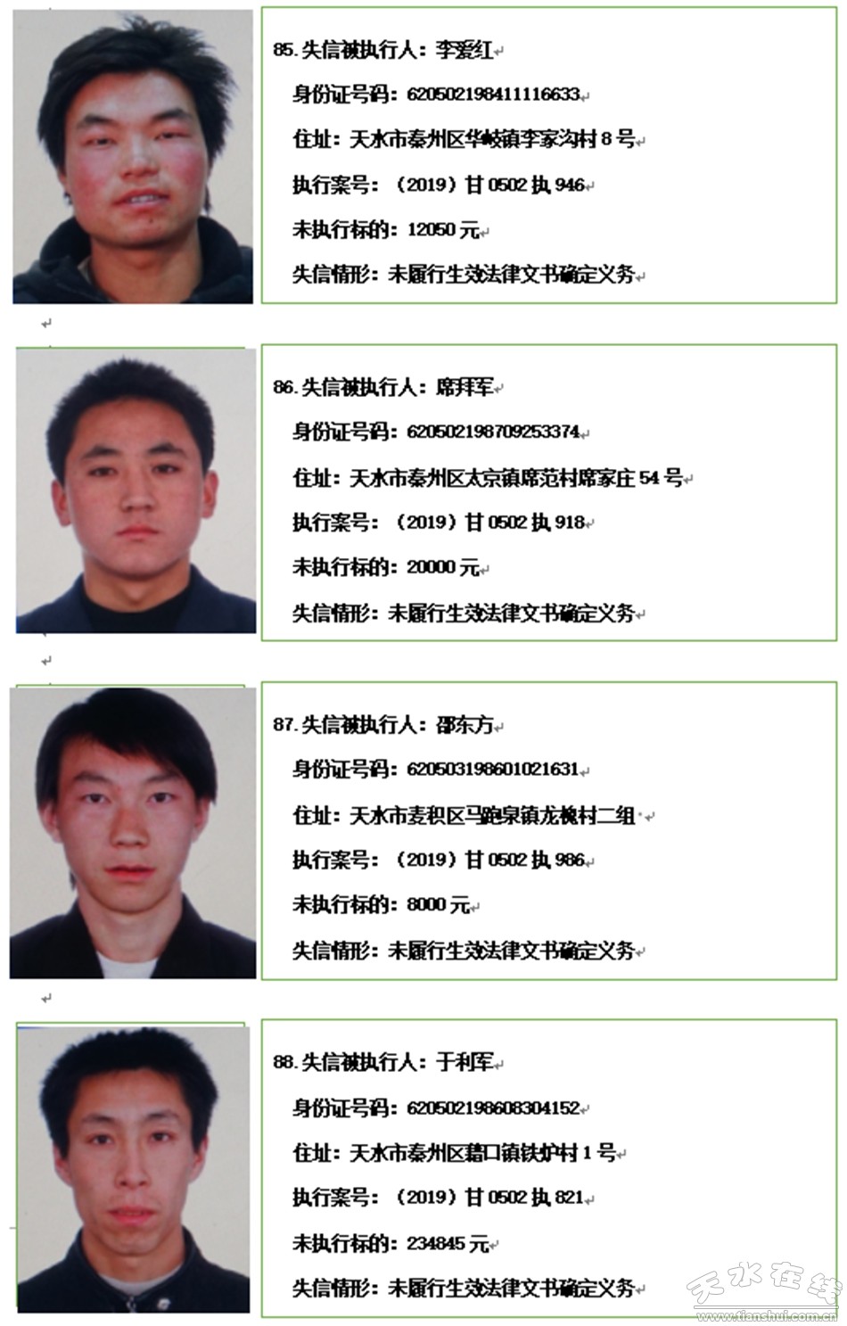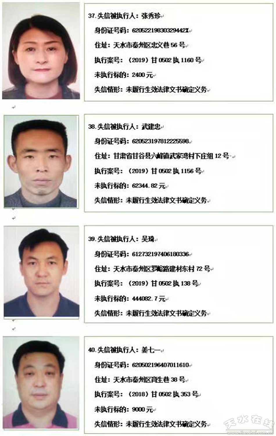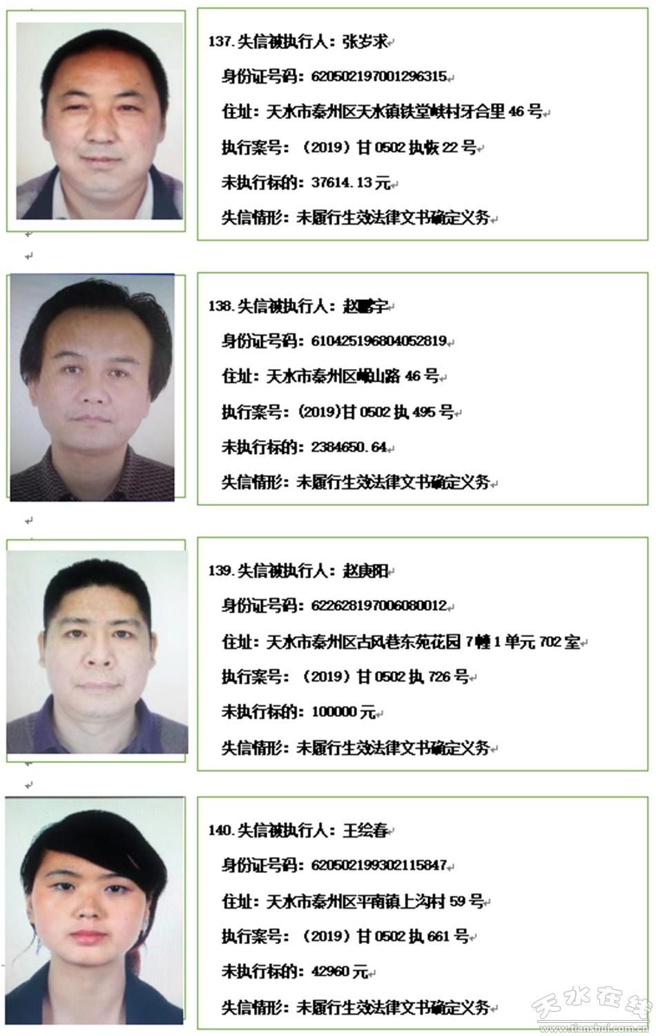 五、歡迎廣大人民群眾向天水市秦州區(qū)人民法院執(zhí)行指揮中心舉報被執(zhí)行人的財產(chǎn)線索和下落,監(jiān)督限制被執(zhí)行人的消費和經(jīng)營行為。監(jiān)督舉報電話:0938-8214290。