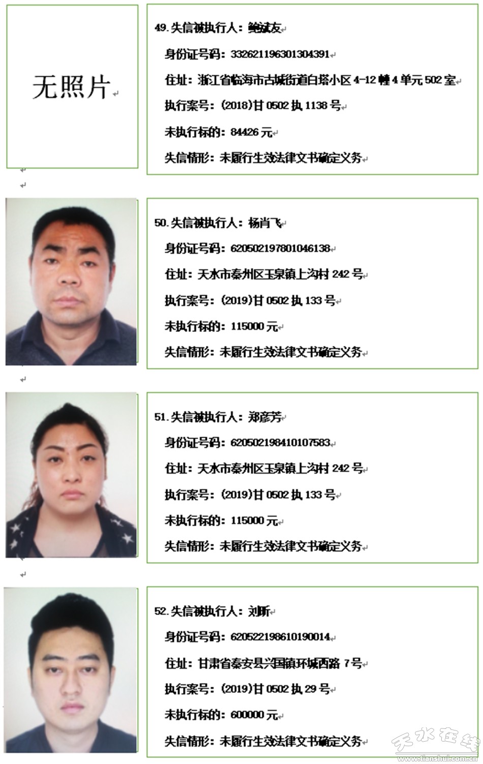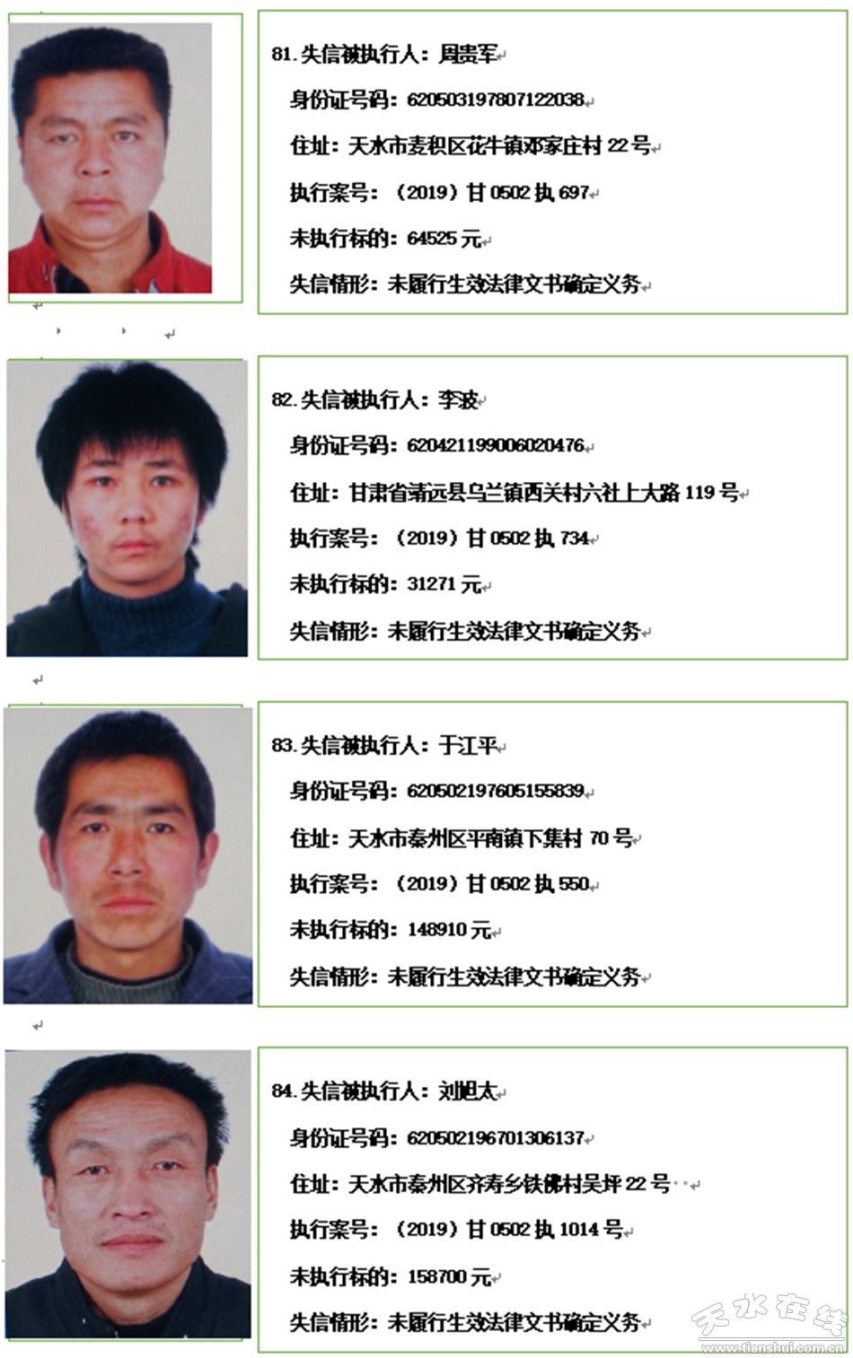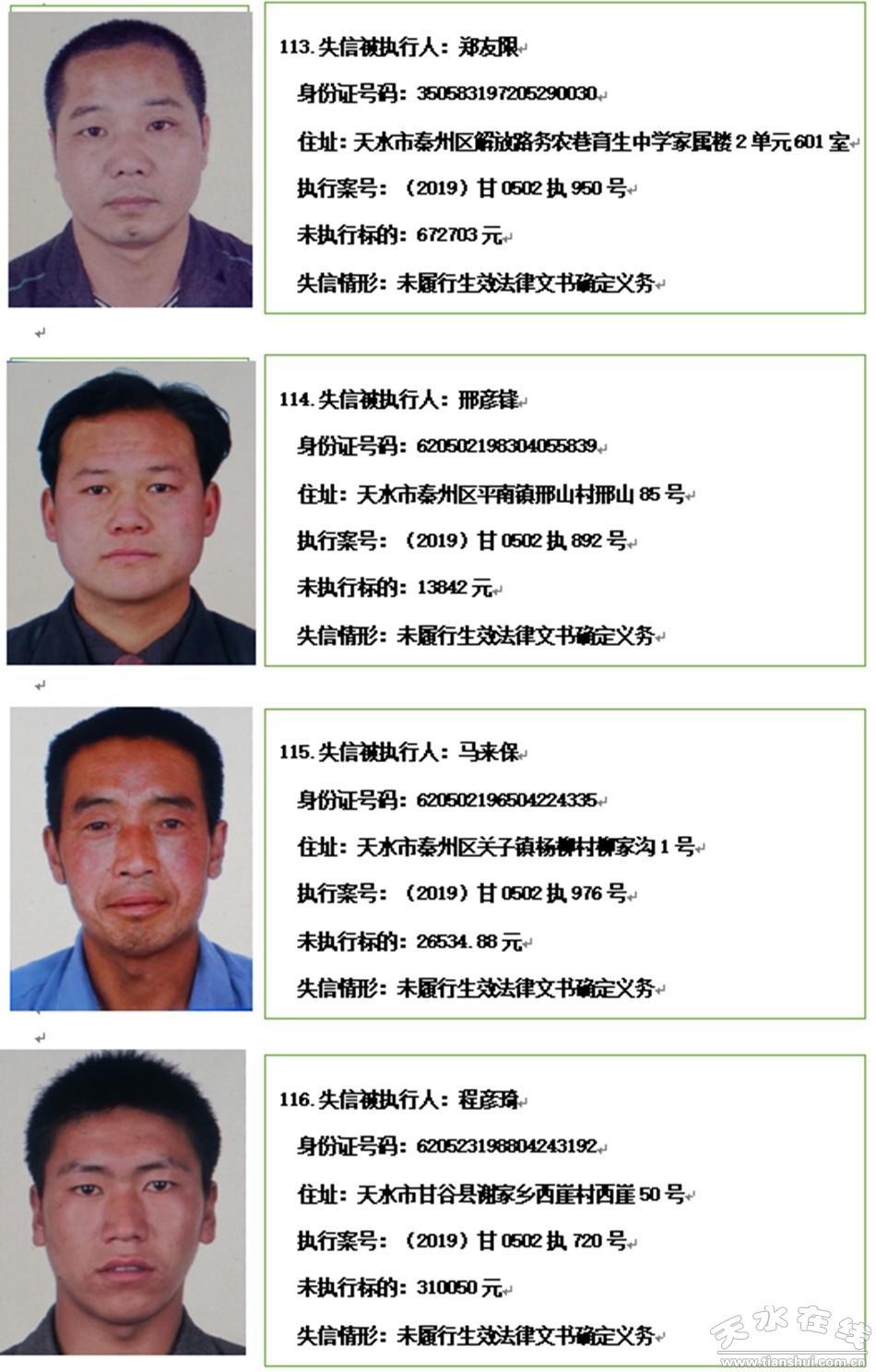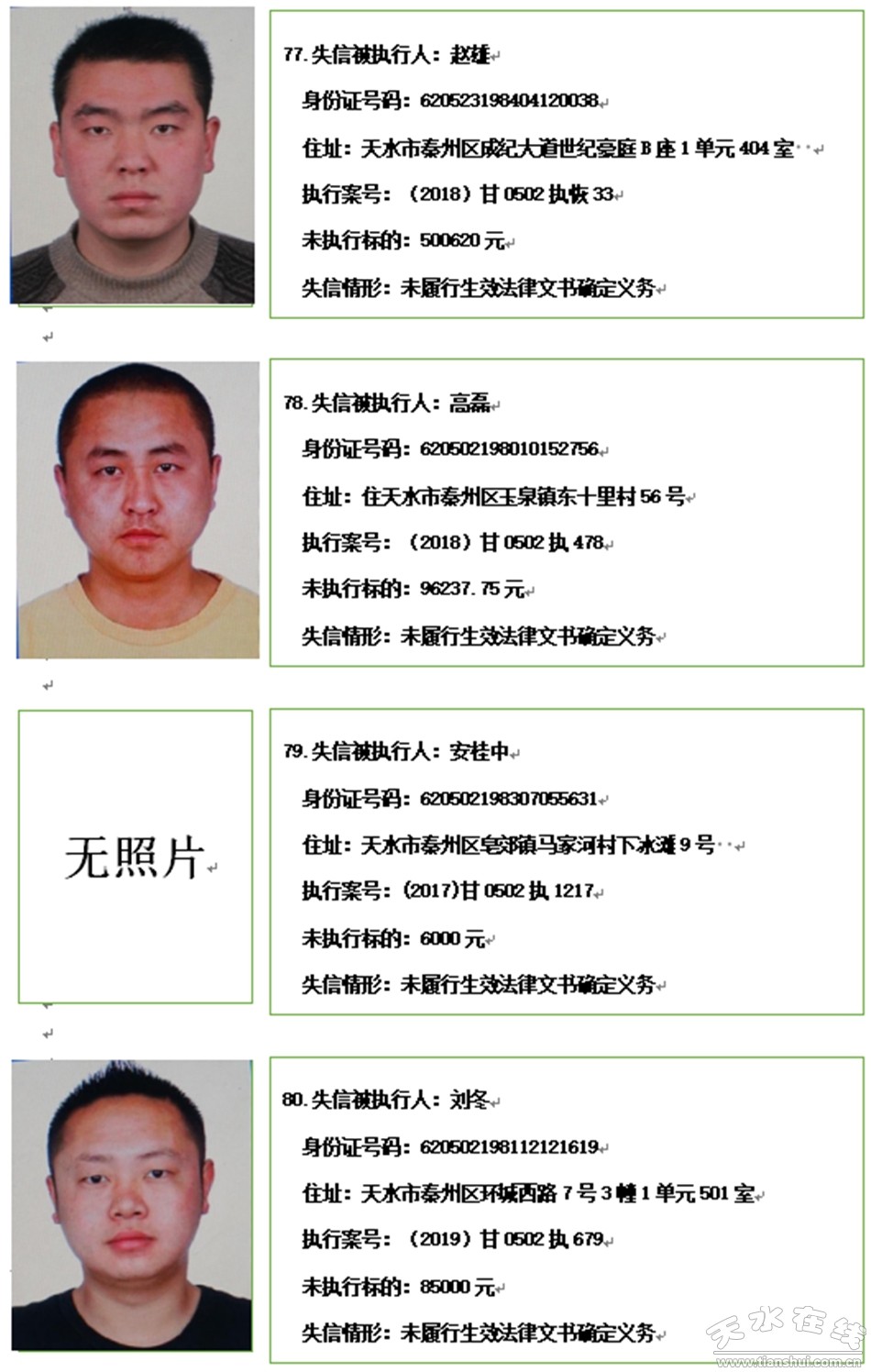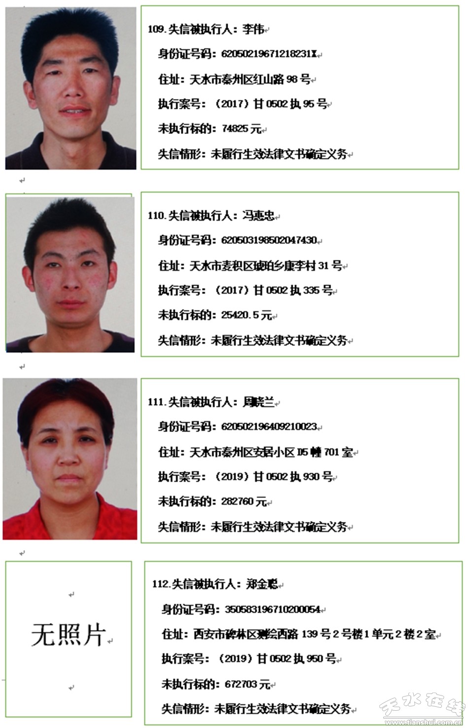 為進一步制裁規(guī)避執(zhí)行行為,保障勝訴當事人的合法權(quán)益,推進社會誠信體系建設(shè),依照《中華人民共和國民事訴訟法》、《最高人民法院關(guān)于公布失信被執(zhí)行人名單信息的若干規(guī)定》等法律、司法解釋的有關(guān)規(guī)定,現(xiàn)對一批已進入執(zhí)行程序,且尚未全部履行義務的被執(zhí)行人進行媒體曝光,并敦促所有被執(zhí)行人自覺履行生效法律文書確定的義務,通告如下: