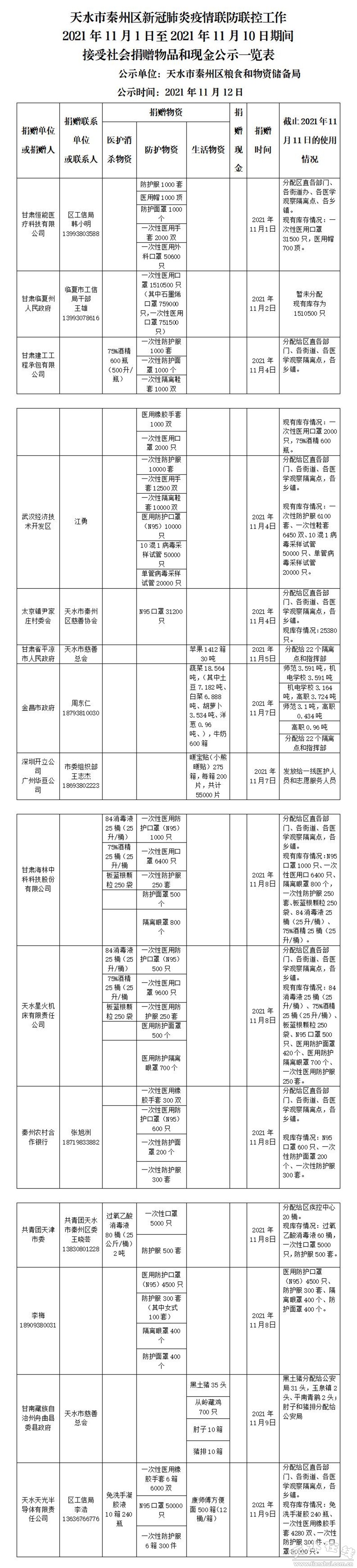 區(qū)疫情防控物資保障組本著尊重捐贈(zèng)者意愿和統(tǒng)籌調(diào)配的原則,將所捐贈(zèng)物資進(jìn)行定向分配使用和統(tǒng)籌分配使用,現(xiàn)將2021年11月1日至2021年11月10日期間所捐贈(zèng)物資的接收和使用情況現(xiàn)進(jìn)行公示,請(qǐng)捐贈(zèng)者和社會(huì)各界進(jìn)行監(jiān)督,具體情況詳見下方《天水市秦州區(qū)新冠肺炎聯(lián)防聯(lián)控工作2021年11月1日至2021年11月10日期間接受社會(huì)捐贈(zèng)物資和現(xiàn)金公示一覽表》