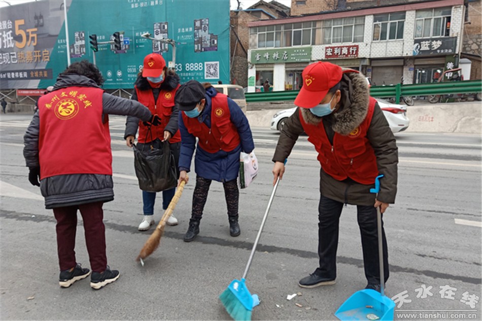 天水郡街道“秦州大媽”志愿者們深入轄區(qū)商戶、背街小巷、小區(qū)、對(duì)亂扔煙頭、垃圾等不文明行為進(jìn)行集中整治。行動(dòng)中,志愿者們不怕臟不怕累,清理垃圾、雜物,勸阻亂扔煙頭、垃圾行為。同時(shí),“秦州大媽”們積極開(kāi)展創(chuàng)城知識(shí)宣傳及衛(wèi)生整治行動(dòng),用自身行動(dòng)發(fā)動(dòng)居民自覺(jué)參與創(chuàng)建工作,營(yíng)造“全民創(chuàng)城”的濃厚氛圍。