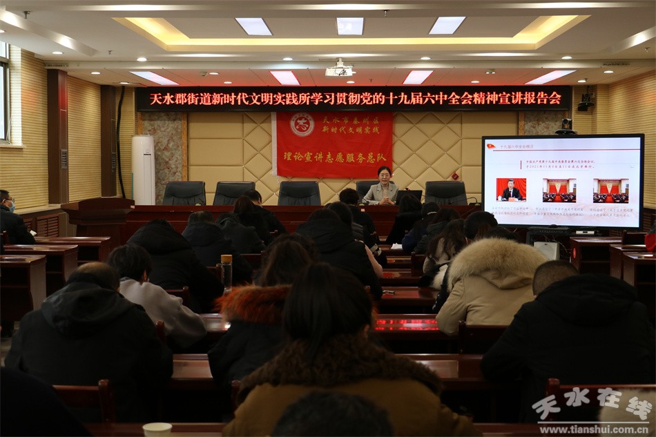 為深入學(xué)習(xí)貫徹黨的十九屆六中全會(huì)精神,12月31日,天水郡街道新時(shí)代文明實(shí)踐所邀請(qǐng)區(qū)委黨校講師在街道會(huì)議室舉行黨的十九屆六中全會(huì)精神專題宣講報(bào)告會(huì)。