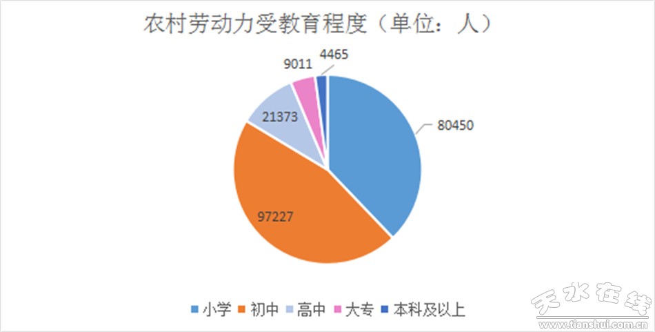 全區(qū)現(xiàn)有農(nóng)村勞動力212526人,其中小學(xué)文化程度80450人,占比37.85%;初中文化程度97227人,占比45.75%;高中文化程度21373人,占比10.06%;大專文化程度9011人,占比4.24%;本科及以上文化程度4465人,占比2.10%。