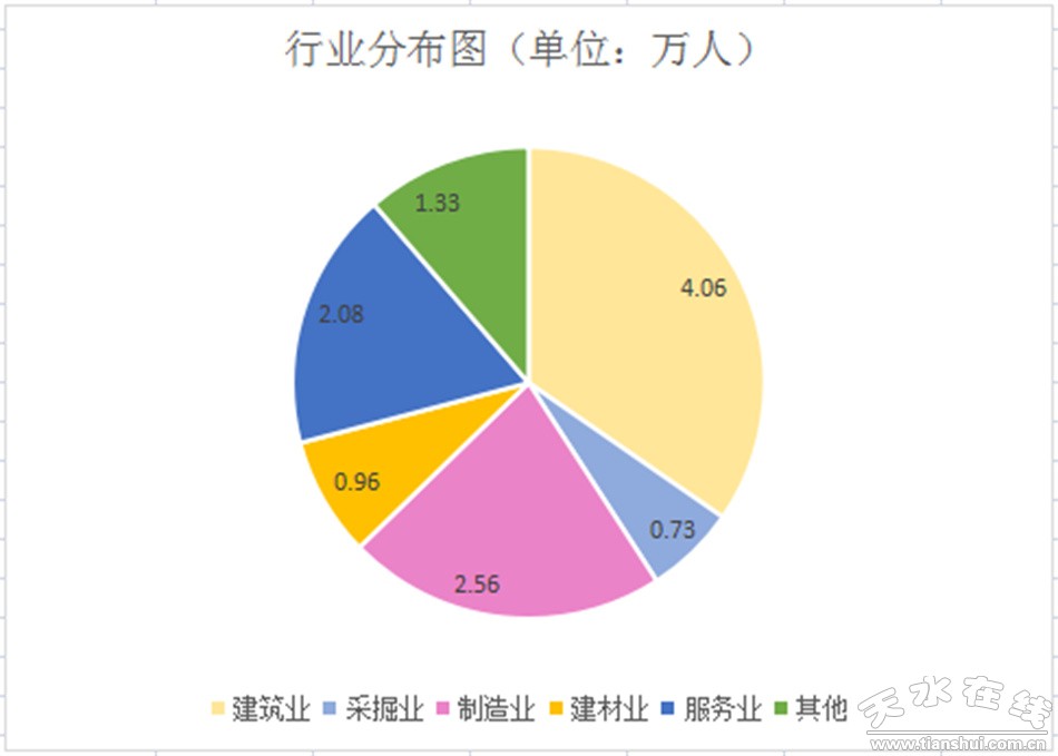 從事第一產(chǎn)業(yè)的1.31萬人,占輸轉(zhuǎn)總數(shù)的11.17%; 從事第二產(chǎn)業(yè)的6.03萬人,占輸轉(zhuǎn)總數(shù)的51.42%;從事第三產(chǎn)業(yè)的4.38萬人,占輸轉(zhuǎn)總數(shù)的37.41%。從事人數(shù)較多的行業(yè)為:建筑業(yè)4.06萬人、采掘業(yè)0.73萬人、制造業(yè)2.56萬人、建材業(yè)0.96萬人、服務(wù)業(yè)2.08萬人、其他1.33萬人。