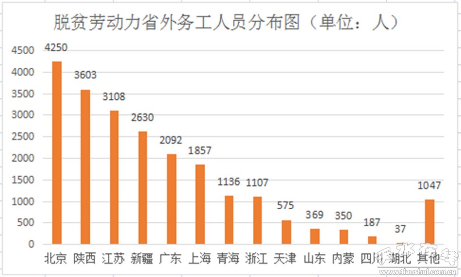 其中脫貧勞動力省外輸轉(zhuǎn)人數(shù)較多的省份為:北京4250人、陜西3603人、江蘇3108人、新疆2630人、廣東2092人、上海1857人、青海1136人、浙江1107人、天津575人、山東369人、內(nèi)蒙350人、四川187人、湖北37人、其他1047人。