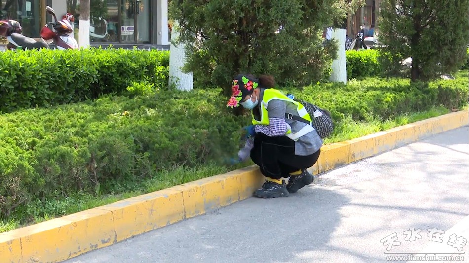 在解放路主干道兩側(cè)的綠化帶,秦州區(qū)園林部門工作人員正在清除綠化帶內(nèi)的雜草,對草坪進(jìn)行精細(xì)化養(yǎng)護(hù)。