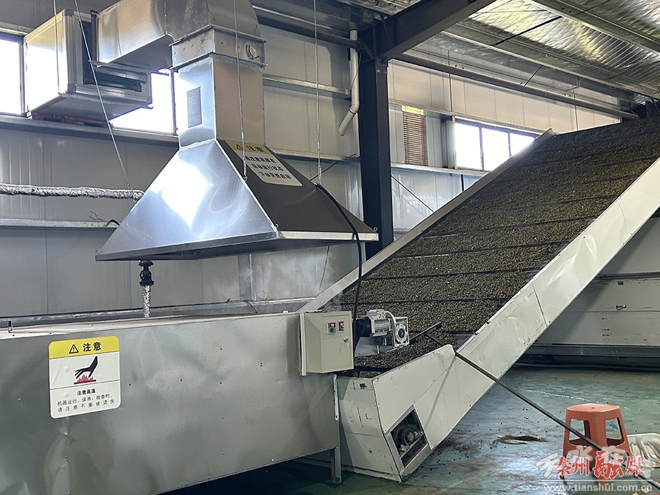 連翹加工廠車間內(nèi),加工設(shè)備繁忙運(yùn)轉(zhuǎn),連翹鮮果通過先蒸青后烘干的自動化程序后,即可變成干品。據(jù)了解,這里一天可加工生產(chǎn)3噸連翹果干品。