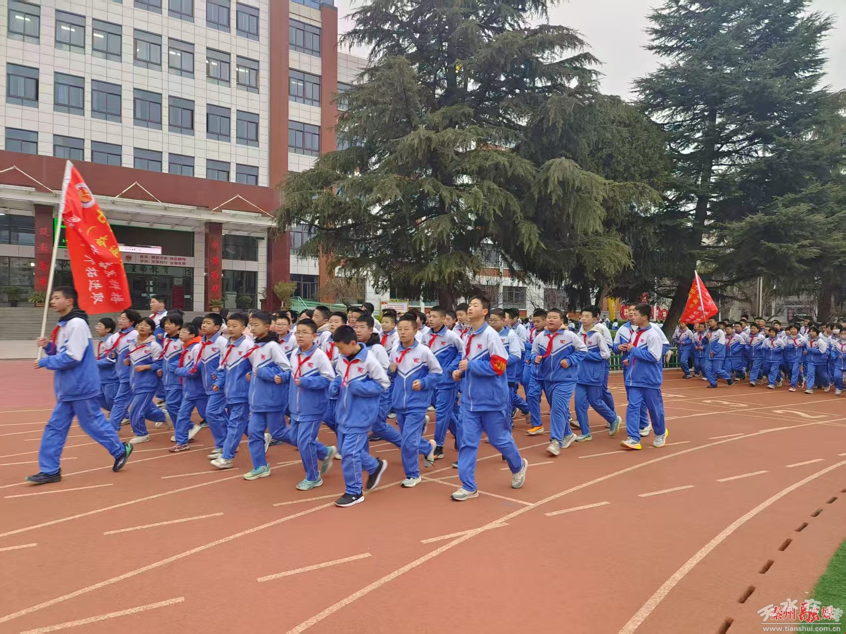 “七八年級并行鍛煉,特意安排七年級以班為單位,整體沿跑道逆時(shí)針跑步,要求排面整齊,在班級旗手和文體委員的帶領(lǐng)下,統(tǒng)一有序地進(jìn)行。八年級充分利用中間足球場,采用花式跑操,既合理利用了有限的操場,又增加了鍛煉的趣味性。”天水市第五中學(xué)體育老師張建平說。