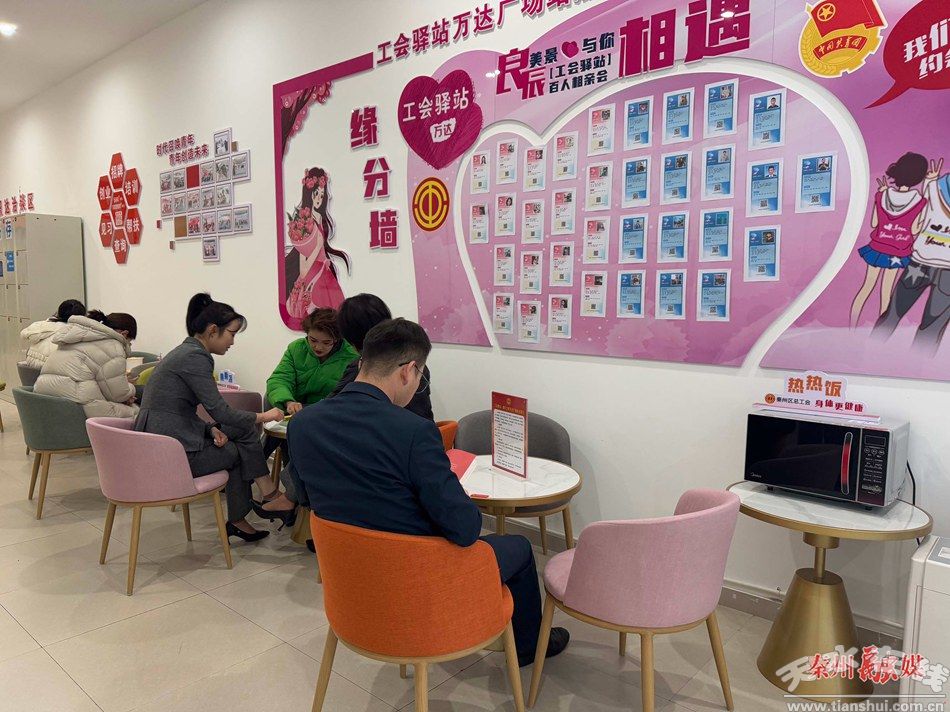“自今年5月份成立以來,設(shè)有相親角、讀書角、心愿墻、自助區(qū)、求職專區(qū)等,設(shè)備有冰箱、電視、飲水機(jī)、微波爐、免費(fèi)寄存柜,在這里大家可以喝喝熱水,停下腳步緩緩身體,使大家的身心得到放松!鼻刂輩^(qū)萬達(dá)廣場工會主席潘英英說。