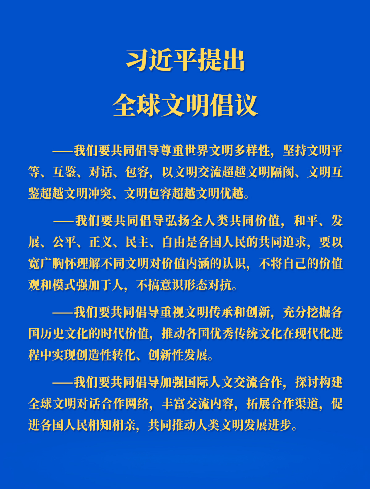 習近平總書記用四個“共同倡導(dǎo)”對全球文明倡議的主要內(nèi)容進行概括,為推動文明交流互鑒、促進人類文明進步提供中國方案。