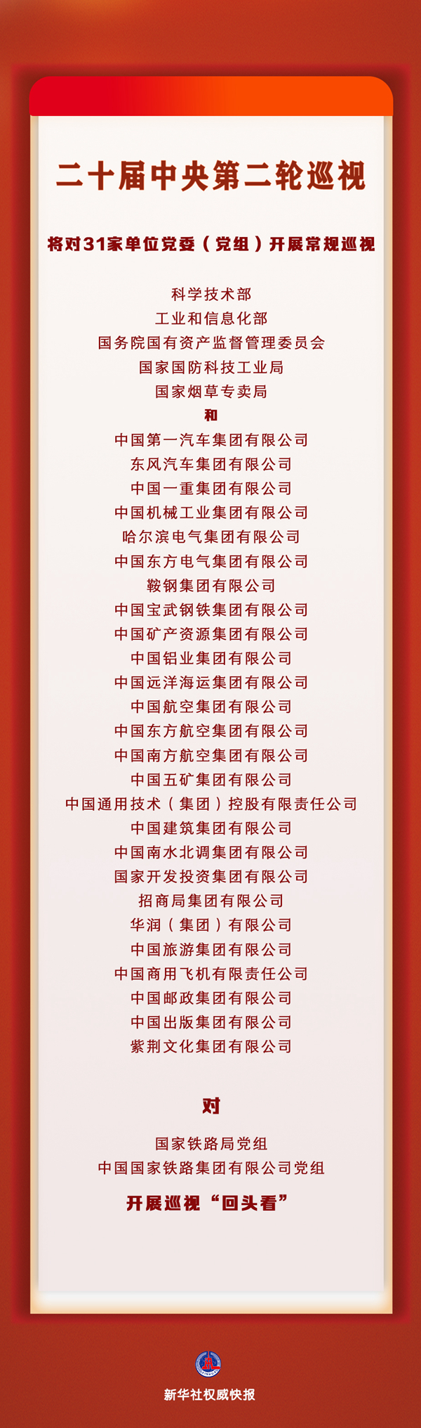 新華社北京10月10日電 經(jīng)黨中央批準(zhǔn),二十屆中央第二輪巡視將對(duì)科學(xué)技術(shù)部、工業(yè)和信息化部、國(guó)務(wù)院國(guó)有資產(chǎn)監(jiān)督管理委員會(huì)、國(guó)家國(guó)防科技工業(yè)局、國(guó)家煙草專賣局和中國(guó)第一汽車集團(tuán)有限公司、東風(fēng)汽車集團(tuán)有限公司、中國(guó)一重集團(tuán)有限公司、中國(guó)機(jī)械工業(yè)集團(tuán)有限公司、哈爾濱電氣集團(tuán)有限公司、中國(guó)東方電氣集團(tuán)有限公司、鞍鋼集團(tuán)有限公司、中國(guó)寶武鋼鐵集團(tuán)有限公司、中國(guó)礦產(chǎn)資源集團(tuán)有限公司、中國(guó)鋁業(yè)集團(tuán)有限公司、中國(guó)遠(yuǎn)洋海運(yùn)集團(tuán)有限公司、中國(guó)航空集團(tuán)有限公司、中國(guó)東方航空集團(tuán)有限公司、中國(guó)南方航空集團(tuán)有限公司、中國(guó)五礦集團(tuán)有限公司、中國(guó)通用技術(shù)(集團(tuán))控股有限責(zé)任公司、中國(guó)建筑集團(tuán)有限公司、中國(guó)南水北調(diào)集團(tuán)有限公司、國(guó)家開(kāi)發(fā)投資集團(tuán)有限公司、招商局集團(tuán)有限公司、華潤(rùn)(集團(tuán))有限公司、中國(guó)旅游集團(tuán)有限公司、中國(guó)商用飛機(jī)有限責(zé)任公司、中國(guó)郵政集團(tuán)有限公司、中國(guó)出版集團(tuán)有限公司、紫荊文化集團(tuán)有限公司等31家單位黨委(黨組)開(kāi)展常規(guī)巡視;對(duì)國(guó)家鐵路局黨組、中國(guó)國(guó)家鐵路集團(tuán)有限公司黨組開(kāi)展巡視“回頭看”。