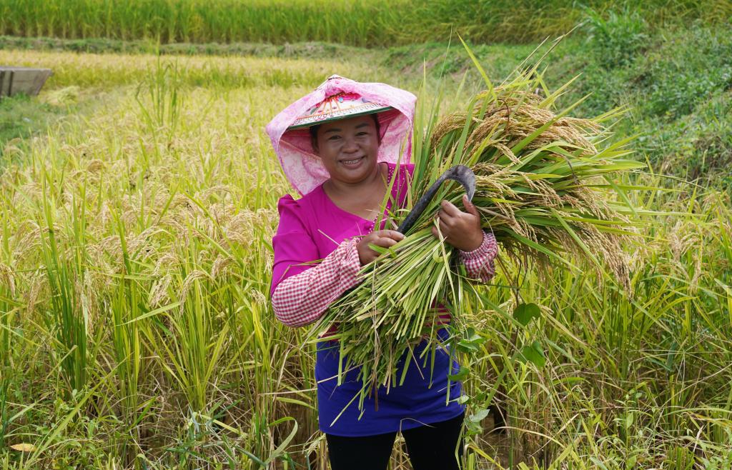 9月22日,在云南省德宏傣族景頗族自治州芒市遮放貢米種植基地,村民展示收獲的稻谷。新華社發(fā)(梁志強攝)